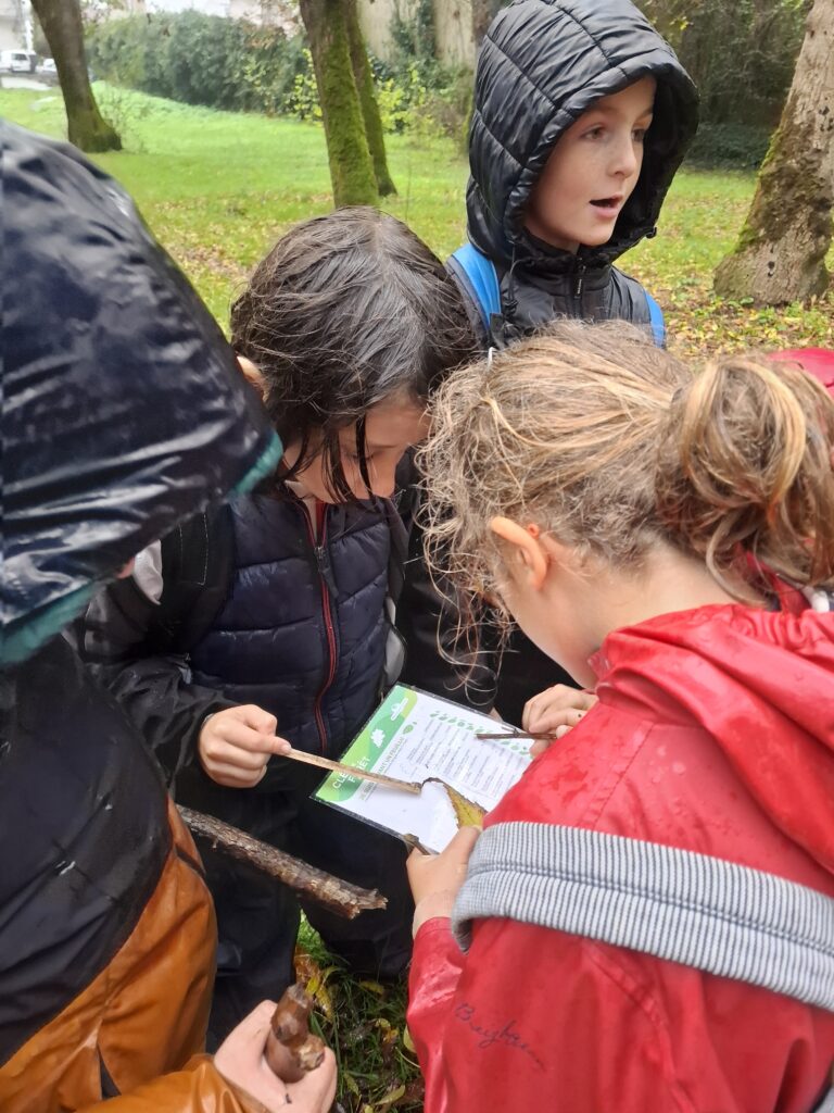 Vendredi après-midi, c’est sous la pluie que les CE2 sont partis dans les bois et ont travaillé en école dehors!