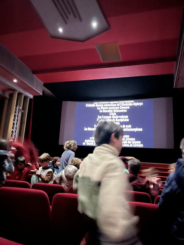 Jeudi 22 décembre : les CP, CE1, CE2 et CM2 sont partis en début d’après-midi et ont longtemps marché pour aller jusqu’au cinéma St Paul, sous quelques rayons d’un soleil hivernal, pour aller découvrir le monde minuscule et fascinant de « Microcosmos ». Une parenthèse enchantée et pleine de poésie! Ce film documentaire hors du commun a suscité de nombreuses questions et sera l’occasion de prolonger cette expérience en classe avec de nombreuses recherches sur les insectes…